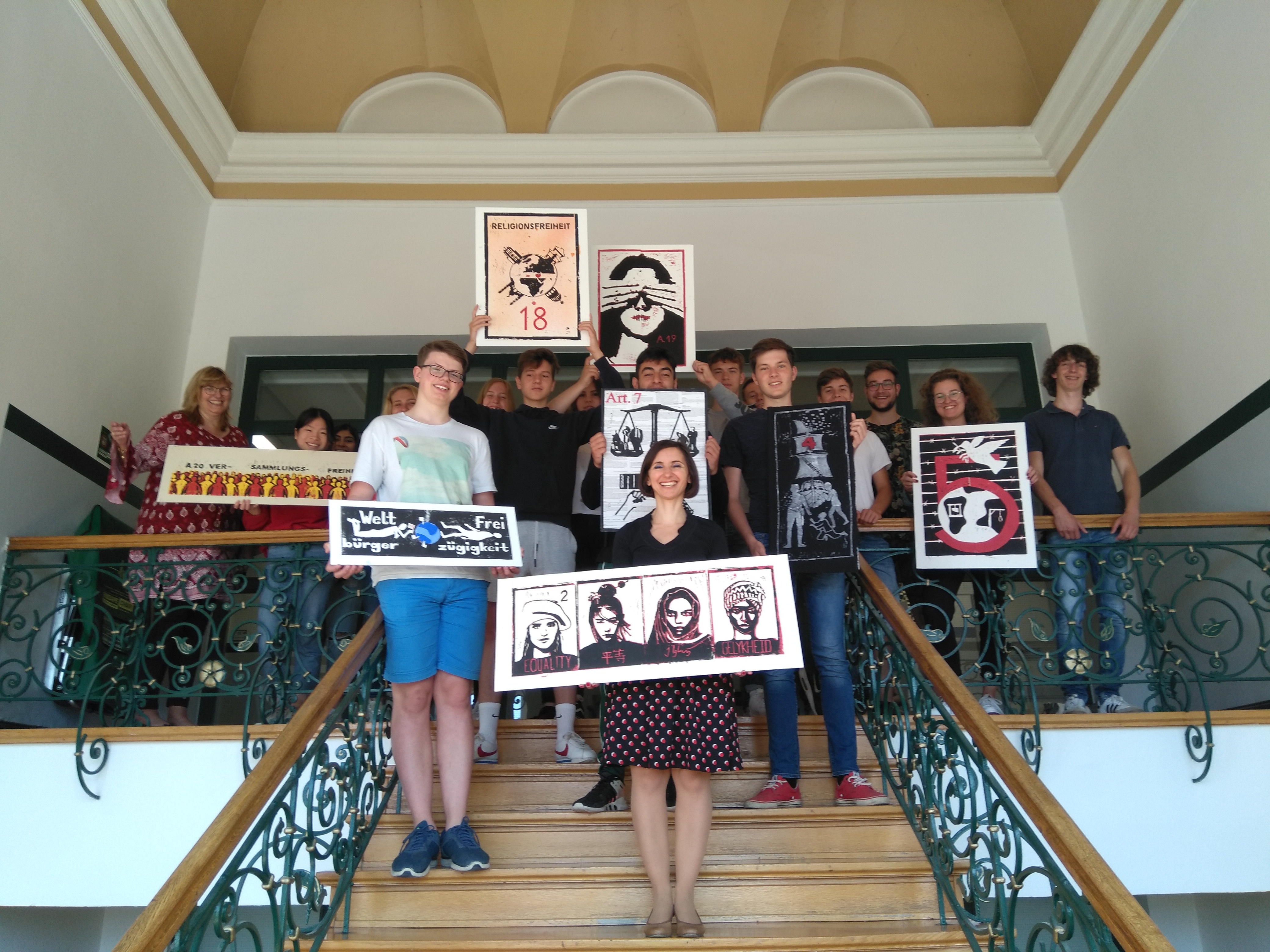 Am 27.06.2019 fand ein Workshop der Behördenleitung mit den Jahrgängen 11 und 12 des Ratsgymnasiums im Fachbereich Kunst statt. Die Schüler/innen hatten Linoldrucke mit verschiedenen Techniken zum Thema "70 Jahre Menschenrechtskonvention" kreiert und sich Gedanken zu den Grundwerten unserer Gesellschaft gemacht. "Ein Thema, das angesichts der aktuellen Vorfälle in Kassel latent vor Augen stehen sollte und was die Schlüler/innen sehr individuell und beeindruckend umgesetzt haben", so die Amtsgerichtsdirektorin Benz. Gemeinsam, unter der künstlerischen Leitung der Kunstlehrerin Dr. Tangian, wurde die bevorstehende Ausstellung der Werke in den Fluren des Amtsgerichts erarbeitet.
